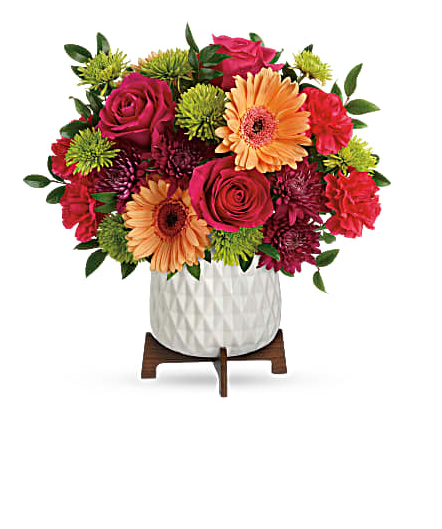 Talk about a bright idea! This cheerful bouquet of peach gerberas brings joy to any occasion--especially since the lucky recipient gets to keep the chic mid-century ceramic planter! This bright bouquet features peach gerberas, hot pink carnations, green cushion spray chrysanthemums, purple cushion spray chrysanthemums, and huckleberry. Delivered in Teleflora's Mid Mod Geometric Planter. Orientation: All-Around
